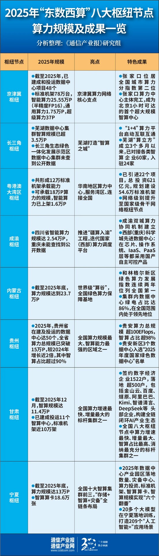 自2022年2月八大國家算力樞紐節(jié)點啟動建設至今,已近4年。《通信產(chǎn)業(yè)報》全媒體研究組梳理了近一年來八大樞紐節(jié)點的最新動態(tài),這期間工程取得了哪些突破性進展?各樞紐節(jié)點的運行效能如何提升?又將為數(shù)字經(jīng)濟發(fā)展帶來哪些新的支撐?