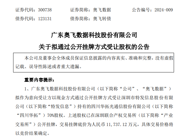 ICC訊 近日,數(shù)據(jù)中心服務(wù)商提供商奧飛數(shù)據(jù)發(fā)布公告稱,擬作為意向受讓方以現(xiàn)金方式通過公開掛牌方式受讓特發(fā)信息持有的四川華拓光通信股份有限公司(簡稱“四川華拓”)70%股權(quán)。上述股權(quán)已在深圳聯(lián)合產(chǎn)權(quán)交易所公開掛牌,交易掛牌底價為1.17億元,具體交易價格將以競價結(jié)果確定。