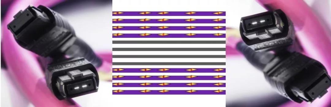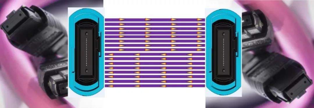 采用多模光纖單波長(zhǎng)單向8通道,每通道傳50G。接口采用16芯專用MPO或采用24芯兩排MPO接口。多模光纖可以采用OM3,OM4及OM5,支持的長(zhǎng)度分別為70米,100米,150米。這種應(yīng)用的特點(diǎn)是:每個(gè)接口需要16芯光纖支持光纖量大,而單波長(zhǎng)應(yīng)用使得收發(fā)器成本低。