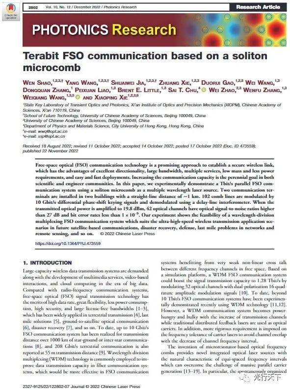 近日,西安光機所超高速空間光通信技術(shù)研究方面獲得重要進展,相關(guān)研究成果以“Terabit FSO communication based on a soliton microcomb”為題,作為封面文章發(fā)表于Photonics Research(光學1區(qū)Top期刊, IF=7.254@2021)2022年第12期。論文共同第一作者為西安光機所博士生邵雯、王陽和郟帥威,共同通訊作者為謝小平研究員和王偉強副研究員。