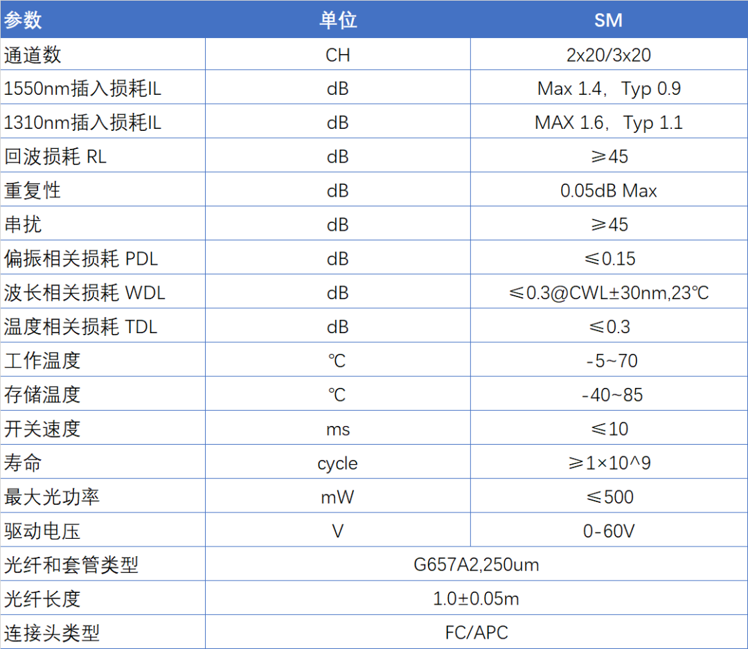 1. 以上測試損耗(IL)是基于中心波長±30nm,23℃下測試的結(jié)果,要求多波段增加0.2dB;