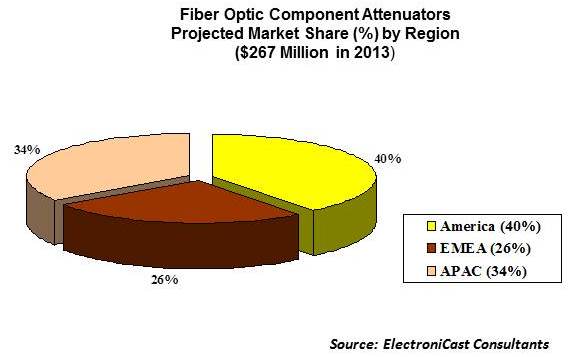 ICCSZ訊 據(jù)ElectroniCast預(yù)測,2013年全球組件級光纖衰減器市場達(dá)到2.67億美元。在預(yù)測期內(nèi),預(yù)計(jì)該市場年均增長率為6.8%,到2018年將達(dá)到3.7億美元。