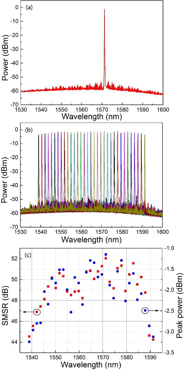 圖2 (a) 多通道干涉激光器的典型的激射譜;(b) 疊加的激射譜從188.4 THz 到 194.8 THz(200GHz間隔);(c) 對(duì)應(yīng)的邊摸抑制比以及峰值功率。