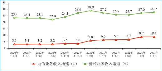 圖1 2020-2021年1-7月電信業(yè)務(wù)收入和電信業(yè)務(wù)總量累計(jì)增速