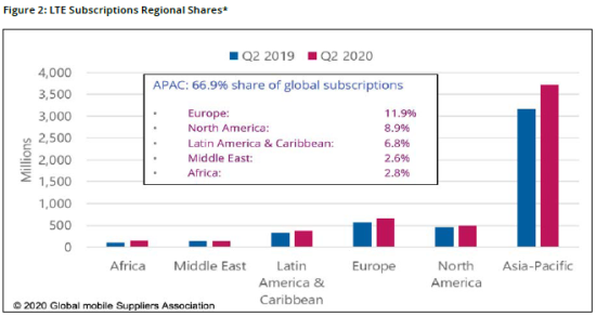 ICC訊(編譯:Nina)2020年9月,Omdia為GSA提供了截至2020年第二季度的全球LTE和5G用戶增長情況。