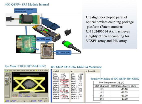 “多路平行光功率實時監(jiān)測對于光網絡的重要性肯定高于單路模塊,畢竟多路光模塊的任何一路出現問題都會導致整個模塊的失敗。一旦光模塊可以實施多路同時監(jiān)控,則意味著高速40G/100G 光模塊不再是一個不可控制的黑盒。通過光功率監(jiān)測環(huán)回,工程師可以設計出自動光功率反饋補償電路,使模塊適應更寬的工作溫度范圍和相對惡劣的外部環(huán)境。多路同時監(jiān)測也保證了各個通道的矢量一致性。易飛揚的40G QSFP SR4 GEN2 光模塊具備著優(yōu)秀的光電性能,各通道的光眼圖裕量均高于30%,各通道靈敏度均優(yōu)于-13dbm.”