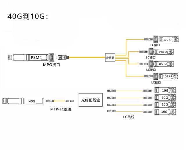 ①現(xiàn)如今最簡(jiǎn)單的SFP+與QSFP+連接方案是使用一根一拖四跳線,一邊是一個(gè)MPO接口,另外四個(gè)為L(zhǎng)C接口,MPO接口連接QSFP+模塊,LC接口連接SFP+模塊,不借助任何設(shè)備就可以進(jìn)行傳輸,節(jié)約了設(shè)備和空間資源,缺點(diǎn)就是跳線有一處損壞整條就得更換;