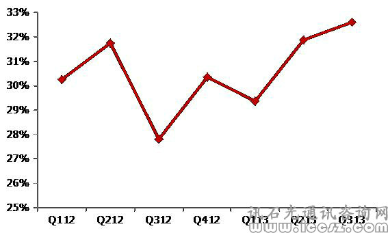 自實施轉(zhuǎn)型戰(zhàn)略以來,阿朗經(jīng)營狀況得到了有效改善,2013年三季度營收為36.68億歐元,同比環(huán)比均得到增長,且季度毛利率得到持續(xù)提升,三季度達到32.6%,并且在2013年三季度阿朗在IP邊緣、IP路由以及光網(wǎng)絡(luò)領(lǐng)域位列全球市場排名前兩位,分別占據(jù)29%、20%、14%的市場份額。