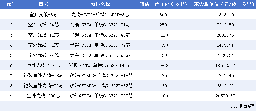 ICC訊 2月15日,中國電信天津分公司啟動2026年室外光纜集采項(xiàng)目。公告顯示,此次采購產(chǎn)品為室外光纜,包含GYDTA、GYTA等室外光纜產(chǎn)品。預(yù)估采購規(guī)模為7610皮長公里。