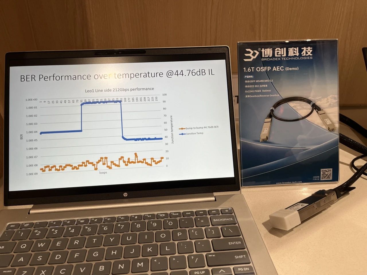 博創(chuàng)科技1.6T AEC 搭載Marvell 最新224G Per lane AEC Retimer芯片在Marvell展臺(tái)展出,該芯片在Line side IL>44dB 情況下,BER優(yōu)于1E-7