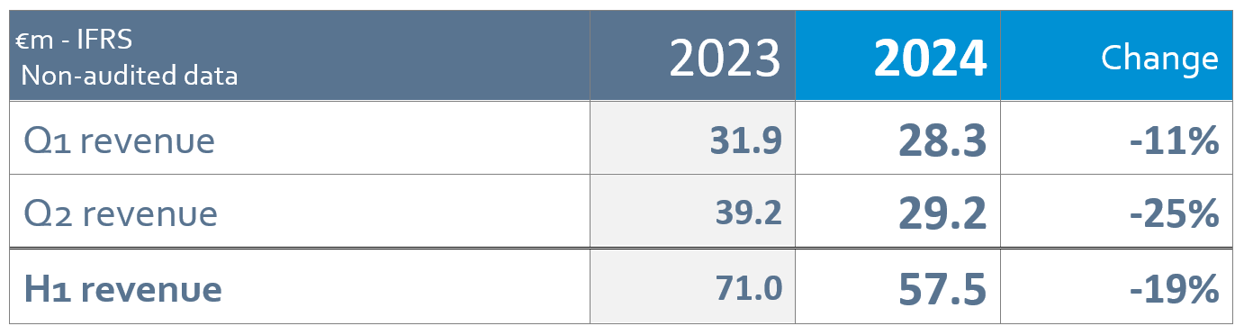 隨著整體經(jīng)濟(jì)放緩,2024年第二季度的活動(dòng)遵循了前幾個(gè)季度的趨勢(shì),連續(xù)四個(gè)季度的收入約為2800萬(wàn)歐元-3000萬(wàn)歐元之間。