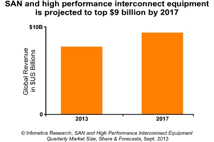 ICCSZ訊 近日,市場調(diào)研公司Infonetics發(fā)布2013年2季度關于SAN和高性能互連設備的市場研究報告,該報告主要關注存儲區(qū)域網(wǎng)絡(SAN)交換機和適配器,以及高性能互連(HPI)設備,同時還包括(FCoE)/以太網(wǎng)交換機和融合網(wǎng)絡適配器。