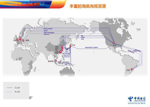 目前,中國(guó)電信通過自有海纜、陸纜、購(gòu)買的容量和國(guó)際衛(wèi)星資源等方式覆蓋全球絕大多數(shù)國(guó)家和地區(qū)。截至2014年底,中國(guó)電信國(guó)際傳輸容量超過9000Gbps。
