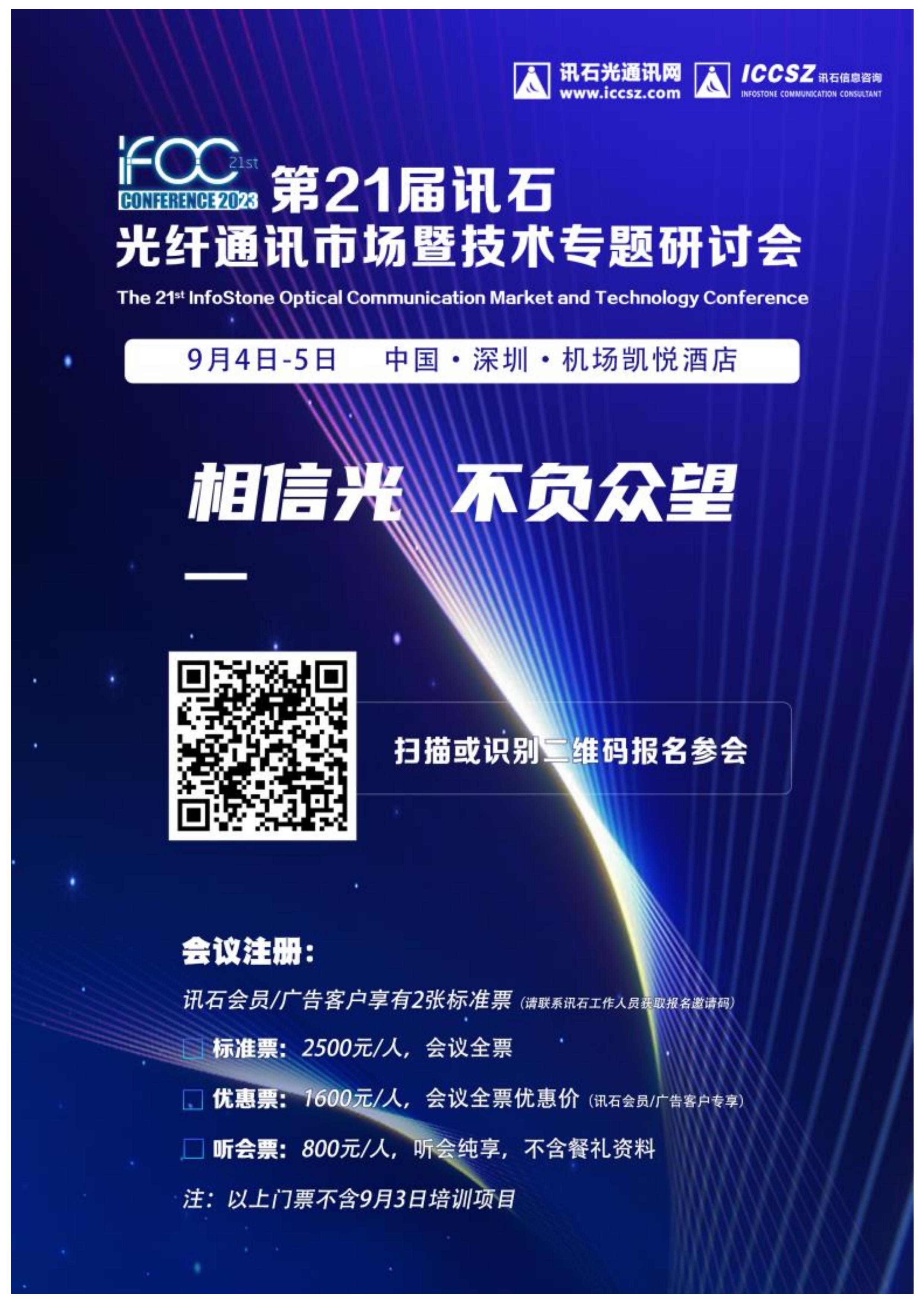ICC訊 相信光·不負(fù)眾望!2023年9月4-5日,第21屆訊石光纖通訊市場(chǎng)暨技術(shù)專題研討會(huì)(iFOC 2023)邀您相約深圳機(jī)場(chǎng)凱悅酒店。匯聚光通訊產(chǎn)業(yè)深入行業(yè)發(fā)展和探索市場(chǎng)增長(zhǎng)契機(jī),重點(diǎn)關(guān)注AI算力、骨干網(wǎng)絡(luò)、城域相干、DCI光互聯(lián)、硅光集成、CPO、光纖接入等應(yīng)用市場(chǎng)需求,層層遞進(jìn)式分析技術(shù)發(fā)展趨勢(shì),深度融入熱點(diǎn)話題,為行業(yè)發(fā)展注入新鮮力量。