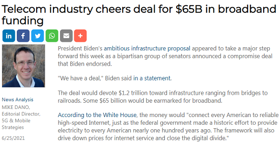 ICC訊(編譯:Nina)據(jù)外媒Light Reading消息,上周,美國兩黨議員宣布了一項拜登支持的折衷協(xié)議,似乎意味著拜登總統(tǒng)雄心勃勃的基礎設施提案向前邁出了一大步。