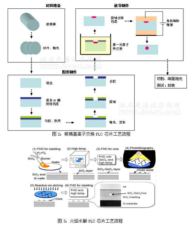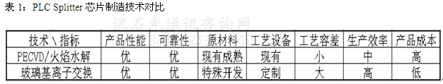 目前PLC Splitter芯片主流技術(shù)包括:PECVD技術(shù)、火焰水解技術(shù)、玻璃基離子交換技術(shù)。玻璃基離子交換技術(shù)的原理及工藝流程參見圖1、圖2所示,火焰水解技術(shù)的主要工藝流程參見圖3所示。其工藝特點對比參見表1。從行業(yè)多年的使用以及可靠性實驗來看,目前兩種技術(shù)都在大規(guī)模的生產(chǎn)使用,性能上不分伯仲。PECVD/火焰水解的特點是:設(shè)備及原材料是現(xiàn)有的材料,但是其工藝很復(fù)雜,生產(chǎn)周期較長,工藝容差??;玻璃基離子交換技術(shù)的特點是:設(shè)備及原材料需要特殊定制,但是其工藝相對簡單,生產(chǎn)效率較高,工藝容差較大,芯片成本相對較低。