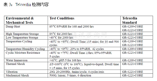 *2012年10月,按照Telcordia GR-1209-CORE和Telcordia GR-1221-CORE標準我們對裸芯片、帶耦合好光纖陣列的半成品、封入管殼的光分路器成品進行了可靠性實驗(參見表3),結(jié)果表明:芯片完全通過相關(guān)可靠性關(guān)測試要求。芯片的可靠性實驗?zāi)壳斑€在延續(xù),截止2013年3月,經(jīng)過3000h的高溫存儲、低溫存儲、高溫高濕存儲以及2000次高低溫循環(huán)測試,芯片各項性能指標正常。