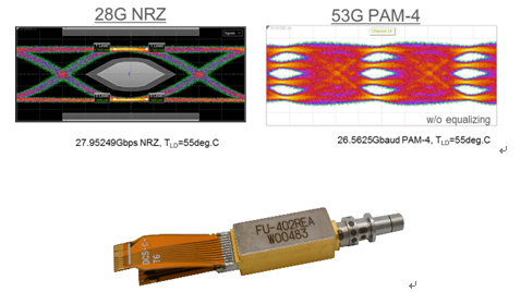 同樣應(yīng)用于5G無線網(wǎng)絡(luò)還有50G PAM4 EML-TOSA FU-411REA-1M1 (10km)/ FU-411REA-3M1 (40km),其適用于NRZ調(diào)制的非常成熟的25GEML TOSA產(chǎn)品,可在26.5625 G波特率,PAM-4調(diào)制下驅(qū)動,其工作溫度為-5℃~+80℃。