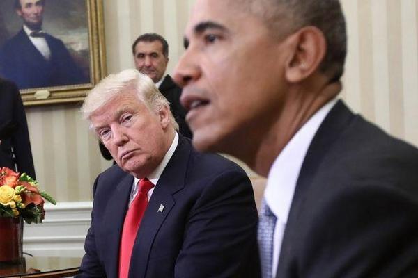 圖為美國(guó)現(xiàn)任總統(tǒng)特朗普(左)與前總統(tǒng)奧巴馬
