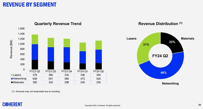 分部門:材料部門營收2.54億美元(占22%),網(wǎng)絡(luò)部門營收5.24億美元(占46%),激光器部門營收3.54億美元(占31%)。