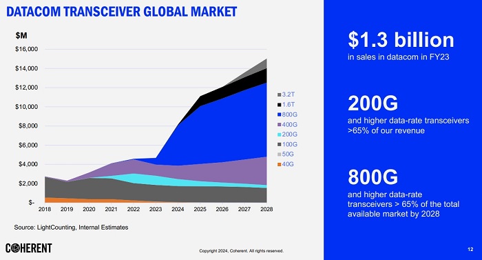 AI/ML:公司的人工智能/機器學(xué)習(xí)(AI/ML)相關(guān)數(shù)據(jù)通信收發(fā)器連續(xù)第三個季度獲得強勁訂單。800G收入環(huán)比增長超過100%,自首次發(fā)貨以來僅一年多的時間就超過了1億美元的季度門檻,這標(biāo)志著該產(chǎn)品是公司歷史上收入增長最快的產(chǎn)品之一。且公司預(yù)計第三財季800G出貨量將環(huán)比增長,第四財季也將環(huán)比增長,因為該產(chǎn)品需求正處于攀升期。Coherent曾表示,2024財年,公司超過50%的數(shù)通收發(fā)器收入將來自于人工智能相關(guān)的應(yīng)用。但Coherent也表示,幾乎所有增長都來自800G,而沒有考慮到數(shù)通中非人工智能業(yè)務(wù)的任何巨大反彈。此外,Coherent對大客戶在1.6T收發(fā)器和器件方面的積極參與感到興奮。為響應(yīng)客戶需求,公司將繼續(xù)朝著預(yù)期在2025財年推出1.6T收發(fā)器和器件的目標(biāo)前進。