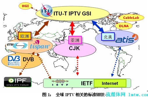 IPTV相關(guān)的標(biāo)準(zhǔn)和技術(shù)規(guī)范制定與推廣工作,主要集中在歐洲、北美和亞洲(中、日、韓,CJK)。各主要組織及其相互關(guān)系如圖1所示。