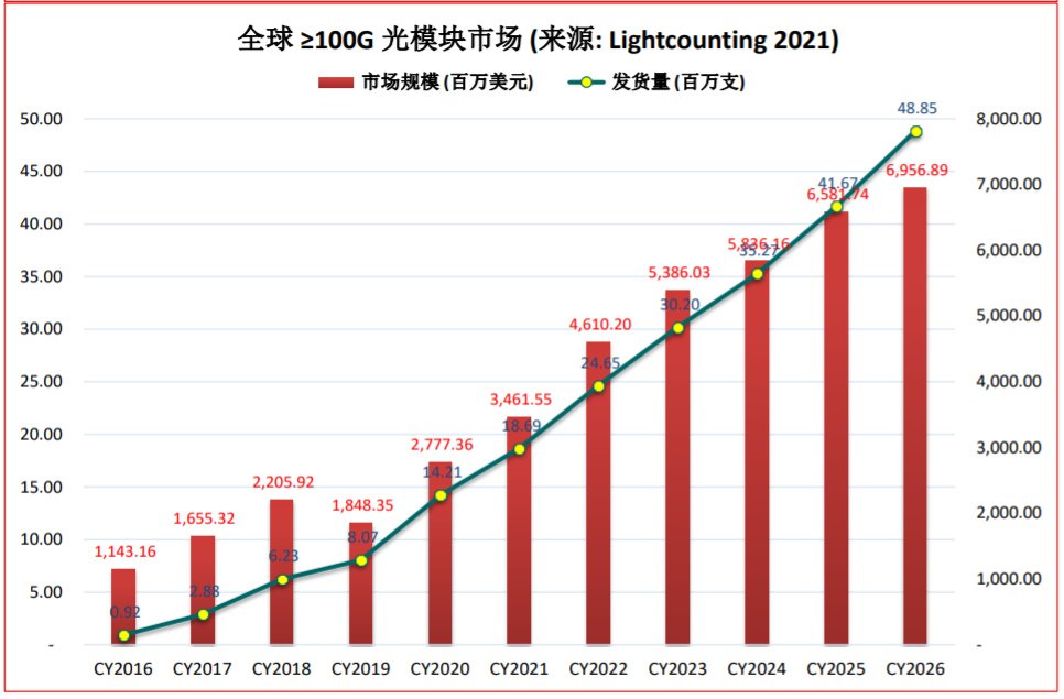 根據(jù)市場(chǎng)咨詢公司Lightcounting預(yù)測(cè), 5G 前傳光模塊的出貨量預(yù)計(jì)將從2020年的3,200萬支下降到2021年的2,725萬支;;100G及以上速率的光模塊出貨量從2020年的1,421萬支迅速增加到2021年1,869萬支、2022年2,465萬支及2026年5,000萬支。預(yù)計(jì)全球光模塊綜合市場(chǎng)采購額將從2020年的81.4億美元增加到2021年的87.2億美元、2022年98.3億美元及2026年145.3億美元。