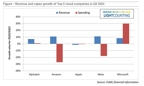 互聯(lián)網(wǎng)內(nèi)容提供商(ICP)和通信服務(wù)提供商(CSP)方面,關(guān)鍵業(yè)務(wù)與前兩個季度的情況一樣,增長放緩;裁員也在繼續(xù),且大多數(shù)企業(yè)預計2023年的支出增長將放緩。特別令人不安的是,排名前四的大型數(shù)據(jù)中心運營商的云服務(wù)銷售增長放緩的長期趨勢在2023年第二季度持續(xù),盡管目前似乎被“人工智能軍備競賽”所掩蓋。如下所示,微軟的收入和支出都創(chuàng)下了歷史新高,超過了其他公司。