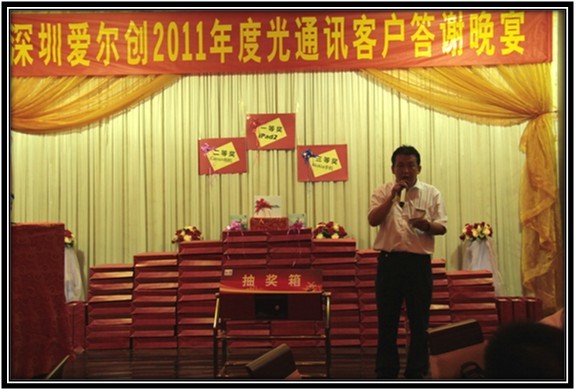 訊石光通訊咨詢網(wǎng)消息,9月7日晚六點(diǎn),深圳愛(ài)爾創(chuàng)科技2011年度光通迅客戶答謝晚宴在會(huì)展中心附近的財(cái)富大廈隆重舉行。為答謝廣大客戶對(duì)深圳愛(ài)爾創(chuàng)長(zhǎng)期以來(lái)的支持,公司特在光博會(huì)期間,廣邀各地客戶,以晚宴形式答謝大家多年的信任,全場(chǎng)有100多名客戶及合作伙伴參加,訊石作為行業(yè)媒體也應(yīng)邀出席?;顒?dòng)現(xiàn)場(chǎng)氣氛熱烈。