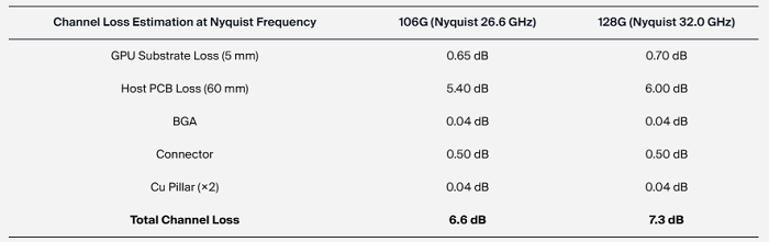 表1. 在106 Gbps和128 Gbps速率下,從XPU到NPO的電通道損耗分解估算??偼ǖ罁p耗已用粗體標(biāo)出。