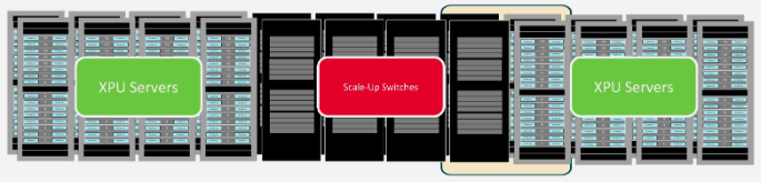 圖8展示了縱向擴展交換機與加速器服務(wù)器解耦部署的示例??v向擴展交換機可集中部署于專用的交換機機柜中,從而在功耗與效率方面實現(xiàn)優(yōu)化。同樣,加速器服務(wù)器機柜也可針對液冷、供電等系統(tǒng)進行專門優(yōu)化。借助支持高達(dá)50米傳輸距離的光互連,以及單跳內(nèi)8至10個服務(wù)器機柜的全連接能力,單跳網(wǎng)絡(luò)內(nèi)可連接的加速器數(shù)量將僅受限于交換機的端口密度。