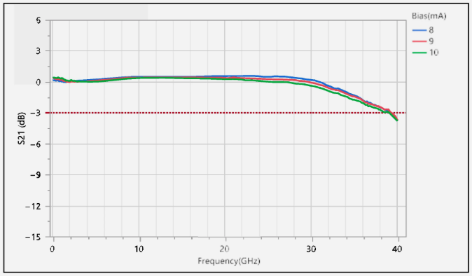 圖4. 偏置電流為8 mA、9 mA與10 mA時的S21響應(yīng)曲線。?3 dB帶寬超過35 GHz。
