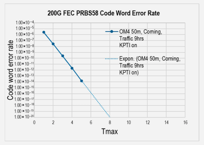 53–56 GBd的PAM4VCSEL的設(shè)計、性能與可靠性已在其他文獻(xiàn)中討論[5]。為支持每通道200 Gbps的傳輸,850 nm VCSEL的帶寬與噪聲性能均已取得顯著提升。2024年3月,在OFC會議上,我們報告了“邁向每通道200G的VCSEL多模鏈路”[16],并演示了200 Gbps傳輸下未糾錯誤碼率低于1×10??的結(jié)果。同年9月,在ECOC會議上,進一步實現(xiàn)了未糾錯誤碼率小于1×10??的200 Gbps多模鏈路傳輸。經(jīng)過持續(xù)改進,在2025年3月的OFC會議上,未糾錯誤碼率達(dá)到了約1×10??。同次會議上,還在50米OM4鏈路上進行了超過9小時的流量測試,期間僅出現(xiàn)最多5個可糾錯的幀錯誤(圖2),展現(xiàn)了優(yōu)異的鏈路穩(wěn)定性。