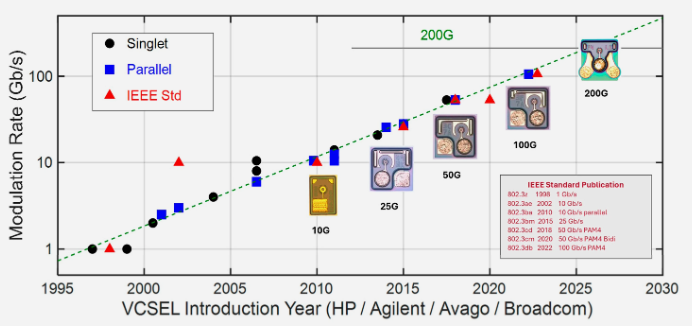 基于垂直腔面發(fā)射激光器(VCSEL)的多模鏈路,以其低功耗、非制冷條件下的優(yōu)異帶寬性能、卓越的可靠性以及低成本的可擴展制造能力為核心優(yōu)勢,已支撐了多代高性能計算和數(shù)據(jù)中心的連接需求[1,2,3,4]。二十余年來,VCSEL(圖1)的性能推動多模有源光纜(AOC)和光收發(fā)模塊在短距光通信信道中占據(jù)了主導(dǎo)地位。目前,能夠在每通道53-56 GBd(標(biāo)記為100 Gbps PAM4)速率下實現(xiàn)四級脈沖幅度調(diào)制(PAM4)的VCSEL已實現(xiàn)量產(chǎn)[5]。而具備100 GBd(標(biāo)記為200 Gbps PAM4)工作能力的850 nm VCSEL的開發(fā),將催生新一代的企業(yè)網(wǎng)、存儲網(wǎng)絡(luò)以及數(shù)據(jù)中心內(nèi)部交換機至服務(wù)器、交換機至交換機的互連。近期,多家研究機構(gòu)與商業(yè)公司[6,7,8]報道了超過100 Gbps PAM4的令人印象深刻的結(jié)果,其中包括采用光刻定義孔徑的VCSEL技術(shù)[9]。此外,橫向耦合腔1060 nm VCSEL設(shè)計[10,11]、單模及多孔徑VCSEL[12,13,14]以及雙向多模鏈路[15]也已得到驗證。我們注意到,在所有這些研究進展中,盡管850 nm VCSEL及其配套的、針對850 nm波長窗口優(yōu)化的標(biāo)準(zhǔn)多模光纖已被廣泛應(yīng)用,但1060 nm VCSEL也日益受到關(guān)注[7,10,11]。這些成果表明,VCSEL技術(shù)有望滿足每通道200 Gbps數(shù)據(jù)通信的需求。