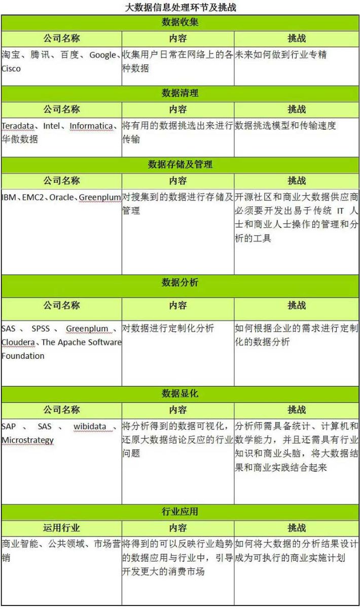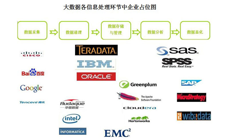大數(shù)據(jù)按照信息處理環(huán)節(jié)可以分為數(shù)據(jù)采集、數(shù)據(jù)清理、數(shù)據(jù)存儲(chǔ)及管理、數(shù)據(jù)分析、數(shù)據(jù)顯化,以及產(chǎn)業(yè)應(yīng)用等六個(gè)環(huán)節(jié)。而在各個(gè)環(huán)節(jié)中,已經(jīng)有不同的公司開(kāi)始在這里占位。
