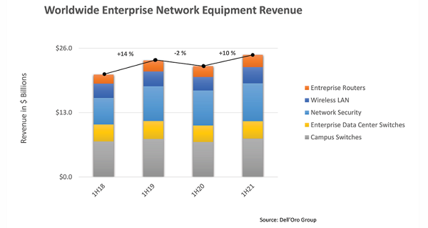 ICC訊(編譯:Nina)近日,Dell'Oro發(fā)布了2021年上半年(1H21)企業(yè)網(wǎng)絡(luò)設(shè)備市場(chǎng)分析報(bào)告。報(bào)告中的企業(yè)涵蓋各種規(guī)模的企業(yè)以及政府、教育和研究實(shí)體,追蹤的設(shè)備包括園區(qū)交換機(jī)、企業(yè)數(shù)據(jù)中心交換機(jī)、企業(yè)路由器、網(wǎng)絡(luò)安全和無線局域網(wǎng)(WLAN),這些設(shè)備可用于私有和安全網(wǎng)絡(luò)中的有線和無線數(shù)據(jù)通信。