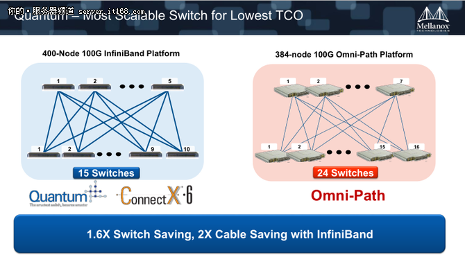 英特爾一直是Mellanox在IB網(wǎng)絡(luò)領(lǐng)域的最重要對(duì)手。其實(shí)英特爾進(jìn)入這一領(lǐng)域的時(shí)間并不長(zhǎng),但是憑借著整合處理器、加速器所帶來(lái)的價(jià)格優(yōu)勢(shì),相比Mellanox來(lái)說(shuō)在整體解決方案層面可以提供更優(yōu)惠的價(jià)格給客戶。為此,Mellanox也從應(yīng)用效率、總體擁有成本等角度為客戶進(jìn)行分析,Eyal Waldman更是直言不諱其中的癥結(jié)所在——