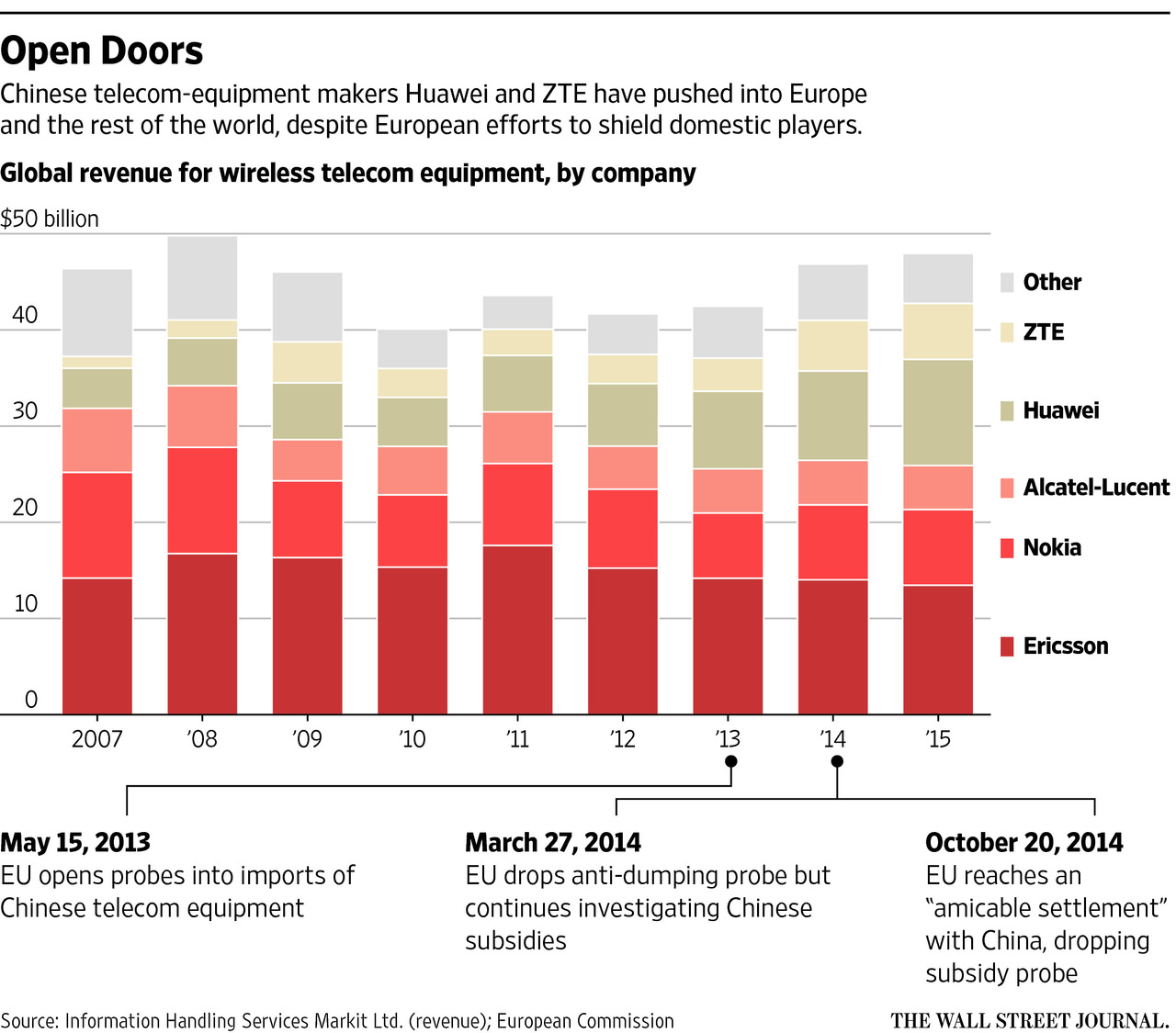 然而,在2014年10月,由于歐洲方面對(duì)此舉并無太多支持,Karel De Gucht擱置了這一調(diào)查舉動(dòng)。相反,他與中國(guó)簽署了一份歐盟委員會(huì)稱之為“友好和解”的協(xié)議,就是這份協(xié)議規(guī)定,需要成了一個(gè)獨(dú)立的委員會(huì)來監(jiān)控電信設(shè)備市場(chǎng)。