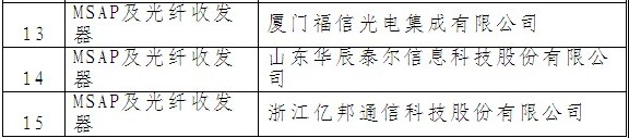 共有15家企業(yè)中標(biāo)2013年中電信MSAP及光纖收發(fā)器集采項(xiàng)目,分別為,安徽皖通郵電股份有限公司、北京彪騏佳訊科技有限公司、北京格林威爾科技發(fā)展有限公司、北京華環(huán)電子股份有限公司、北京康邁爾通信技術(shù)有限公司、北京明訊恒基科技發(fā)展有限責(zé)任公司、北京正有網(wǎng)絡(luò)通信技術(shù)股份有限公司、廣東九博電子科技有限公司、杭州初靈信息技術(shù)股份有限公司、江西山水光電科技有限公司、南京普天通信股份有限公司、瑞斯康達(dá)科技發(fā)展股份有限公司、廈門福信光電集成有限公司、山東華辰泰爾信息科技股份有限公司、浙江億邦通信科技股份有限公司。