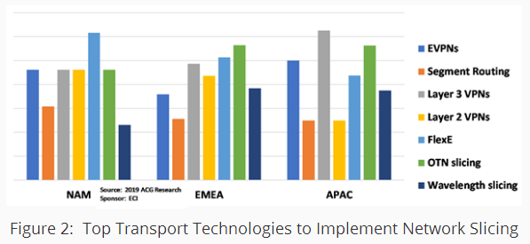 FlexE是服務(wù)提供商打算測試和利用以實(shí)現(xiàn)傳輸網(wǎng)絡(luò)切片的頂級技術(shù)之一。FlexE是所有地區(qū)的頂級技術(shù) - 在北美排名第一,在EMEA排名第二。OIF今年再次在OFC進(jìn)行FlexE演示。雖然FlexE在商業(yè)可用性或部署方面仍處于早期階段,但其通過信道綁定和子速率復(fù)用將IP/以太網(wǎng)移動流量映射到底層光傳輸?shù)哪芰Γ瑸榉?wù)提供商提供了靈活的選擇,使其在分離和分割I(lǐng)P/以太網(wǎng)流量同時也最大限度地利用底層光傳輸。