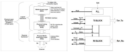 圖1 PCIe Gen1與Gen2物理層功能分工(左)與方塊圖(右) 圖片來源:英特爾