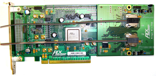本文提出的概念驗證展示的電路板(圖4)包含內(nèi)建四十八通道PCIe Gen3交換器適配卡的主控計算機,以及一個搭配交換器的光發(fā)射器與接收器模塊子板,在光學(xué)聯(lián)機的另一端,另一個包含光收發(fā)器與接收器模塊的交換器接口卡位于電路板上,藉以提供快速周邊,如固態(tài)硬盤驅(qū)動及以太網(wǎng)絡(luò)(Ethernet)HBA卡的輸出與數(shù)據(jù)整合。