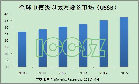 以太網(wǎng)設(shè)備方面的投資繼續(xù)快于其他的電信設(shè)備,預(yù)計到2015年,全球電信級
