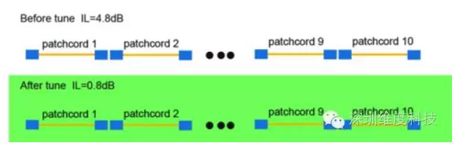 實驗時沒有經(jīng)過調(diào)芯的10條光纖連接器串聯(lián)的接入損耗IL=4.8dB,每個光纖連接器經(jīng)過調(diào)芯后再串聯(lián)的接入損耗IL=0.8dB