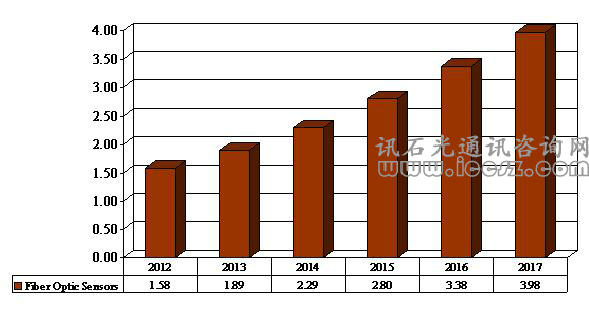從上圖可以看出光纖傳感市場每年都在不斷增長,并且在預(yù)測期2013至2017年的年復(fù)合增長率為20%。