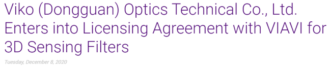 ICC訊(編譯:Nina)美國加州時間,2020年12月8日--VIAVI Solutions公司(納斯達克:VIAV)今天宣布,東莞微科光電科技有限公司(Viko (Dongguan) Optics Technical Co., Ltd.)已同意就使用VIAVI受專利保護的低角度位移(LAS)濾光片達成許可協(xié)議。該濾光片用于3D傳感技術(shù)領(lǐng)域。微科光電主要生產(chǎn)紅外截止濾光片組立件(IR Cut Filer)、光學低通濾波器(OLPF)及各種窄帶膜、高反膜、分光膜等光學窗口片。