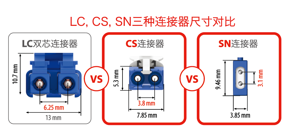 單個SN連接器帶有兩個外徑為1.25mm的LC型陶瓷插芯,兩個插芯的間距3.1mm,而LC雙芯連接器的插芯間距為6.25mm。SN連接器的每個插芯可以單獨組裝、研磨和測試,制造商可以輕松地控制連接器的每根光纖連接。