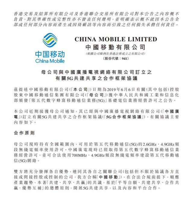 近日,中國移動接到母公司通知,已與中國廣播電視網(wǎng)絡有限公司(下稱“中國廣電”)簽署5G共建共享合作框架協(xié)議,開展5G共建共享以及內容和平臺合作。