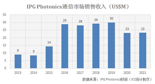 據(jù)IPG Photonics財(cái)報(bào)顯示,2021年,該公司來自通信(Communications)市場的銷售收入為2300萬美元,僅占公司總銷售收入的1.6%。IPG Photonics的通信業(yè)務(wù)包括應(yīng)用于數(shù)通和電信網(wǎng)絡(luò)基礎(chǔ)設(shè)施市場的光收發(fā)器產(chǎn)品以及應(yīng)用于陸地和衛(wèi)星寬帶的光放大器和拉曼激光器產(chǎn)品。