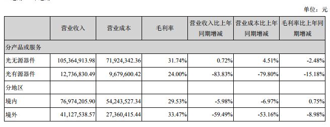 報告期內(nèi),光分路器和DWDM器件客戶需求較為平穩(wěn),光無源器件產(chǎn)品實現(xiàn)收入1.05億元,較上年同期增長0.72%。在有源器件方面,因公司主要客戶進行產(chǎn)品結(jié)構(gòu)調(diào)整,導(dǎo)致公司原有ROSA產(chǎn)品銷售大幅下降,光有源器件產(chǎn)品實現(xiàn)銷售收入0.13 億元,較上年同期下降83.83%